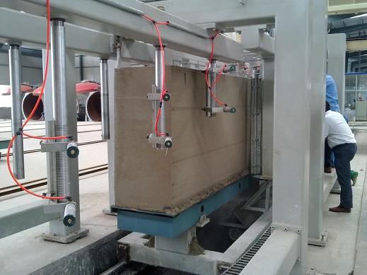 澆注后模具用輸送鏈推入初養(yǎng)室進行發(fā)氣初凝,室溫為50~70℃,初養(yǎng)時間為1.5-2小時(根據地理有利條件,可免去此工藝),初養(yǎng)后用負壓吊具將模框及坯體一同吊到預先放好釜底板的切割臺上.脫去模框.切割機即對坯體進行橫切、縱切、銑面包頭,模框吊回到運模車上人工清理和除油,然后吊到模車上組模進行下一次澆注,切好后的坯體連同釜底板用天車吊到釜車上碼放兩層,層間有四個支撐,若干個釜車編為一組。 加氣塊切割機